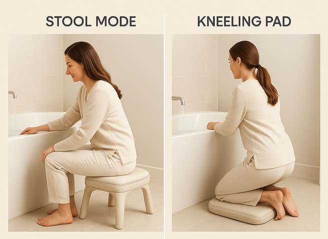 Bath Bestie switches from a comfortable seat to a kneeling pad in seconds. The legs fold flat so you can store it away easily or kneel comfortably by the tub — no tools required.